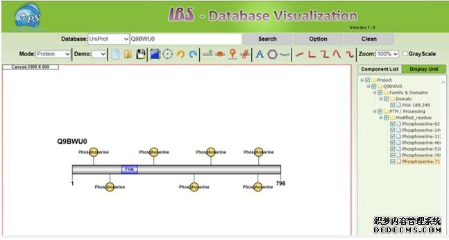 IBS可以直接依据蛋白质在Uniprot数据库的ID编号,绘制结构图 (http://ibs.biocuckoo.org/dbvisualization.php).例如基因SLC4A1AP编码的蛋白结构和蛋白上的修饰图如下。