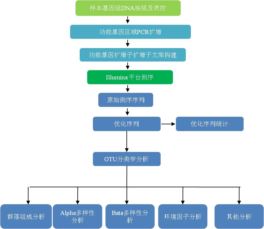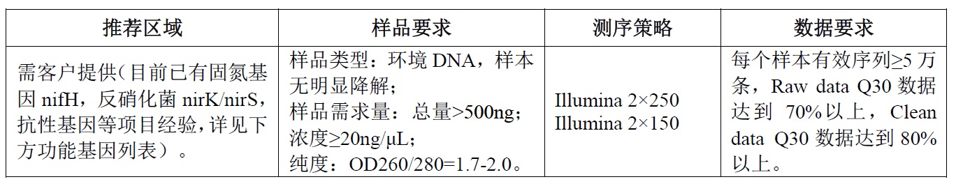 功能微生物是在自然界中由于其功能的重要性而受到广泛关注的一类微生物,如硝化细菌、反硝化菌、氨 氧化细菌、硫酸盐还原菌、固氮菌、固氮菌等。每种功能微生物在分类学上可能有很大不同,但却具有相类似的基因使其能够发挥同样的功能,因此使这些功能细菌发挥这种特定功能的基因就称为功能基因,如 nxrA、nirS/nirK、amoA、dsrB、nifH、nifH。功能基因测序,作为一类特殊的微生物扩增测序项目,是根据复杂环境中具有特殊功能的微生物基因序列设计引物,用该引物进行 PCR 扩增,建库后高通量测序。功能基因测序可有效研究特定环境中的功能微生物物种信息, 包括:功能微生物物种差异、分类和丰度等,并与每个采样点的环境因子相结合,可以同时分析环境因子与功能细菌群落结构的关系,因此对复杂环境中的微生物构成研究有重要的指导作用。