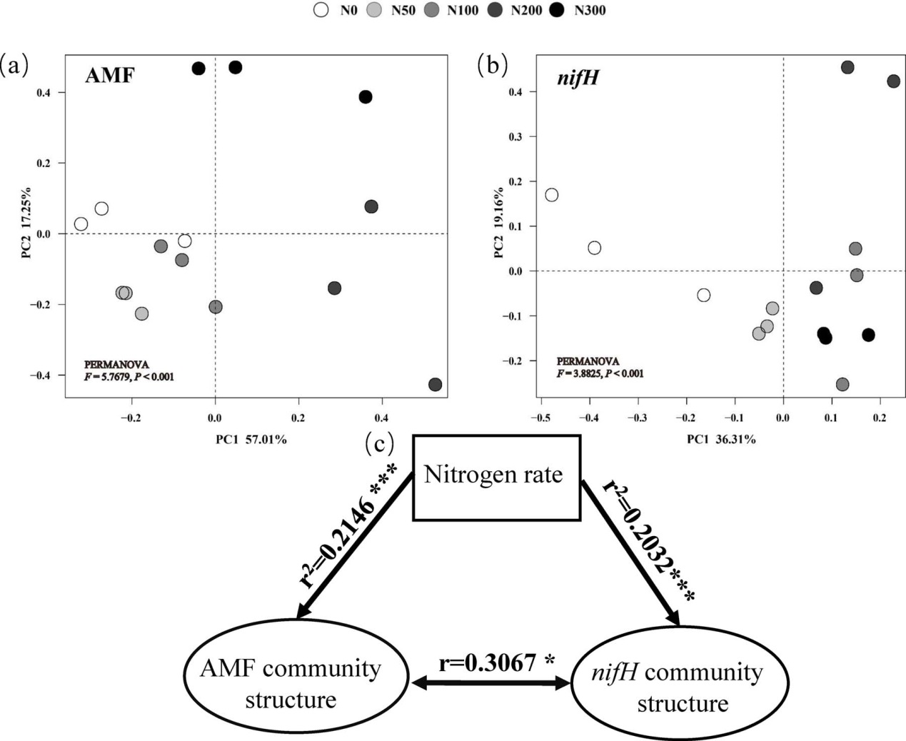 图2 不同施氮处理组丛枝菌根真菌(AMF)(a)和固氮菌(nifH)(b)群落结构PCA分析,AMF和nifH群落结构与不同氮肥处理浓度之间的Mantel检验(c)
