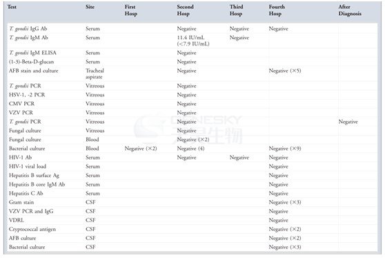 使用PCR对单纯疱疹病毒,巨细胞病毒,弓形体病的玻璃状液检测结果呈阴性。脑磁共振结果显示有很多的环形增强和幕上和幕下病变的扩散受限,被认为符合脓肿以及重度梗阻性脑积水。血液,尿液和脑脊液的细菌和真菌培养结果都是阴性的。脑脊液的神经梅毒,肺结核和隐球菌科的检测结果也是阴性(Table1)。弓形虫病在脑脊液和血清学的检查结果也是阴性。