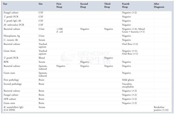 通过宏基因组测序在脑脊液中鉴定到能比对上阿米巴原虫核糖体RNA基因的序列。随后的PCR反应确认了阿米巴原虫在脑脊液、脑组织和受感染的眼睛玻璃体液中的存在。血清学和免疫组化对脑活检组织中阿米巴原虫的检测也呈阳性。因此宏基因组测序是一个功能强大的诊断工具,能够快速鉴定病原菌,从而为早期靶向治疗提供帮助。