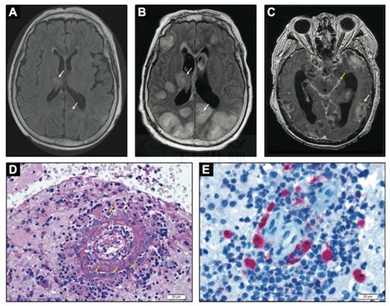 图1:神经影像学和神经病理学。(A)轴向T2加权/液体衰减反转恢复序列(FLAIR)脑磁共振成像(MRI)显示多个高信号(箭头),分别对应扩散加权成像上的受限扩散区域。(B)轴向T2加权/液体衰减反转恢复序列(FLAIR)脑磁共振成像(MRI)显示多个高信号的大小和数目。(C)增强轴位T1加权MRI显示多个环形强化病变(白色箭头),基底脑膜炎(黄色箭头)以及重度脑积水。(D)脑实质过碘酸-希夫染色切片显示了坏死性血管炎,慢性炎性细胞,和大量类似巨噬细胞的阿米巴滋养体(箭头);大多数的组织显示一个强烈伴随混合性炎症的坏死性血管炎伴,包含了大量巨噬细胞和嗜酸性粒细胞。(E)免疫组织化学显示了大量活的阿米巴原虫滋养体。